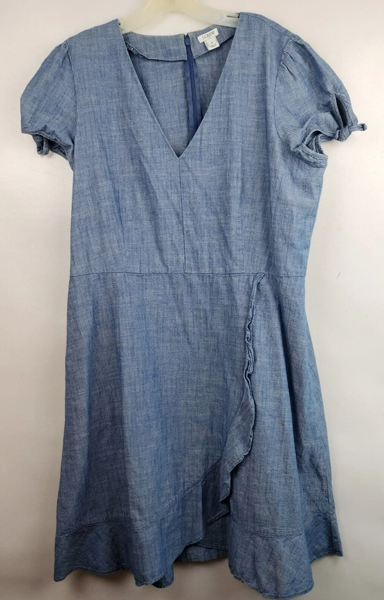 J Crew Womens Midi Dress Sz 10 Blue Cotton Chambray Denim Ruffle Hem Tie Sleeve Ebay